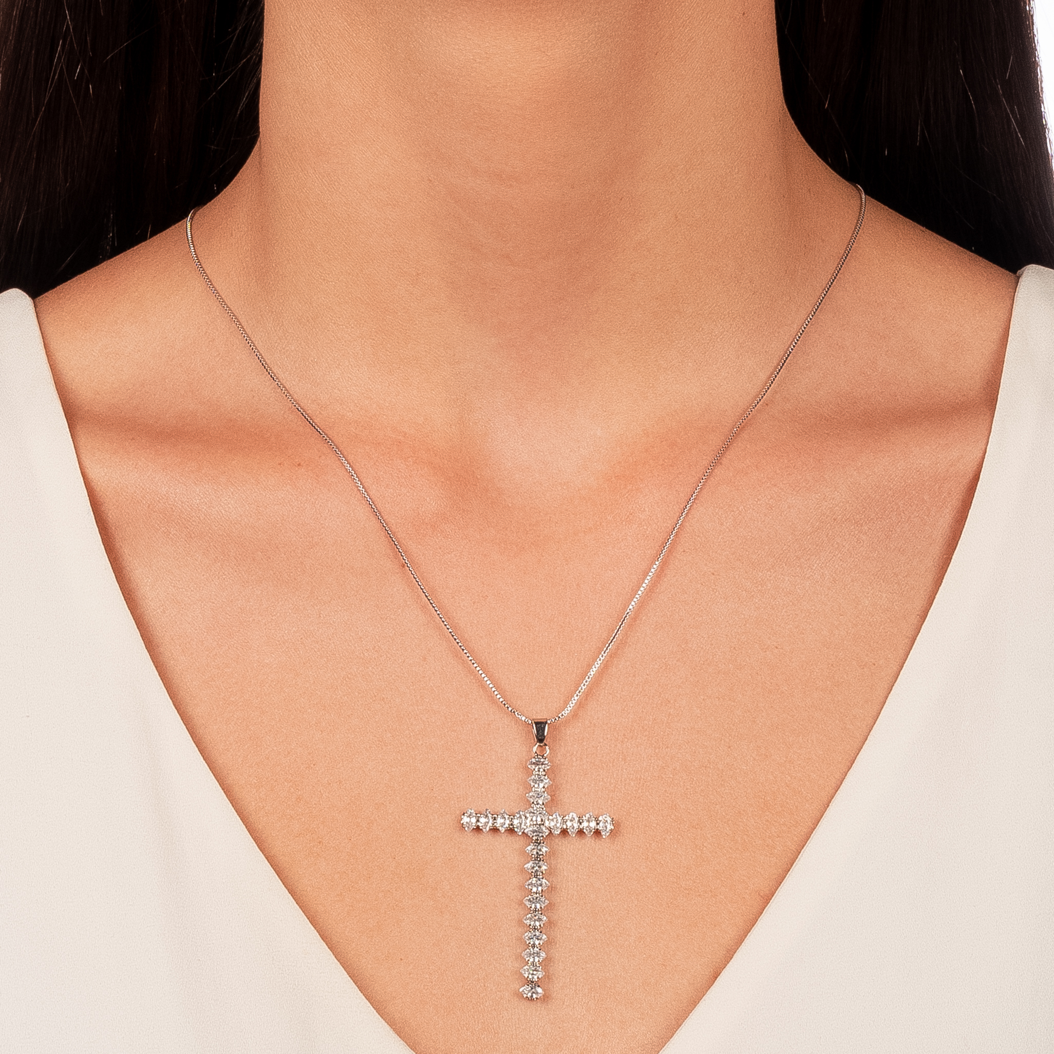 O Colar Cruz Longa em Ródio Branco com Zircônias Navet é a personificação da elegância clássica com um toque de sofisticação moderna. O pingente em formato de cruz é inteiramente cravejado com zircônias lapidadas em forma de navete, que capturam e refletem a luz com um brilho deslumbrante, proporcionando um visual imponente e luxuoso.