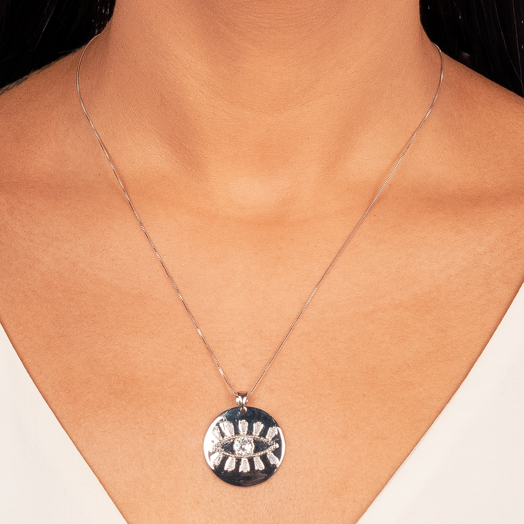 O pingente redondo com acabamento altamente polido reflete a luz com intensidade, enquanto o desenho do Olho Grego cravejado com cristais proporciona um brilho sofisticado e delicado. Os cristais lapidados ampliam o contraste e criam uma aura luminosa que destaca o pingente mesmo à distância.